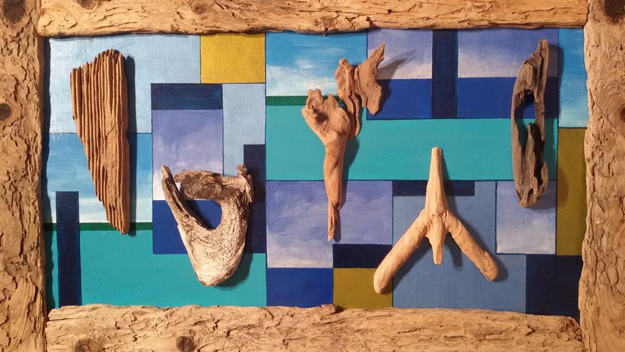 Driftwood pieces gathered from beaches in Italy and Wales with driftwood frame 70X50cm