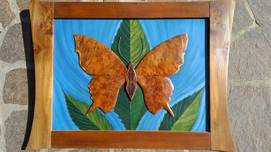 Burr yew butterfly with frame in elm and larch. The elm frame was reclaimed from an 18th century coaching house staircase in Wiltshire, which must have a very interesting history in terms of who may have trodden its boards over 200 years ago. Antennae are copper wire. |
