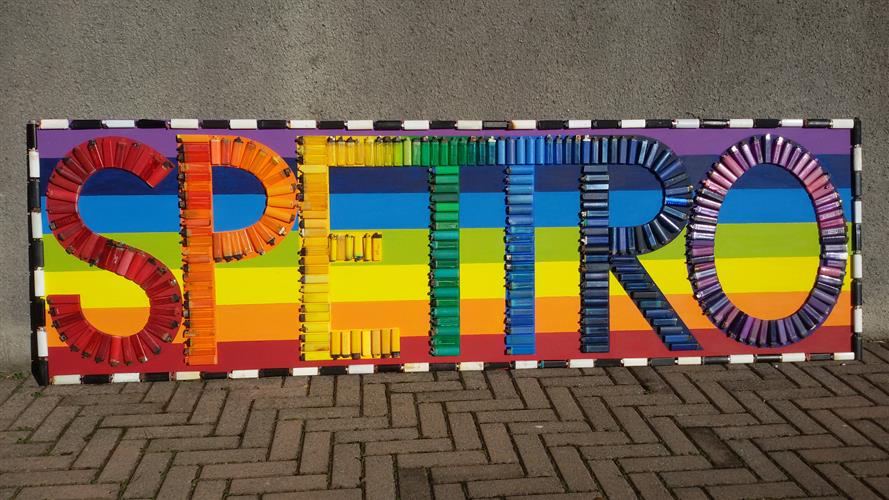Two hundred dead lighters collected from beaches in Wales and Italy arranged in the colours of the visible electromagnetic spectrum