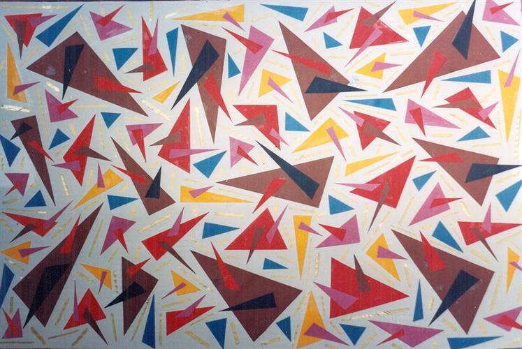 These are randomly-cut card triangles pasted on card, in a kind of homage to Brownian motion.