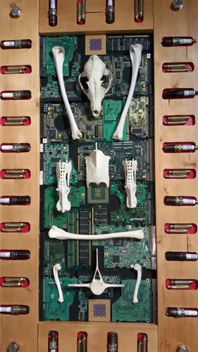 Skulls and bones mounted on printed circuit board. Frame contains recessed spark plugs and rifle cartridges