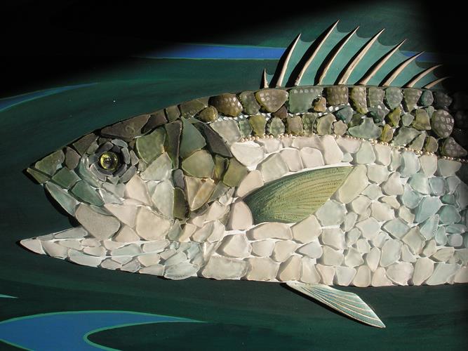 Bass made of sea glass, thorns, beads and driftwood fragments. Frame made from sanded and polished driftwood. Approx 150x70cm (Private collection)