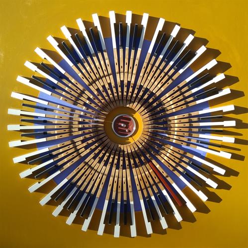 This is a big radial composition made of piano keys rescued from an old piano which was about to be burnt. The title “Unfinished Symphony” reflects the fact that one key was missing, which was substituted by a red radial element. In the centre is a ball bearing and the rim of a ginseng coffee tin. |