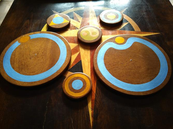 Wooden plates and coasters in reclaimed mahogany on nettlewood (bagolaro) low coffee table